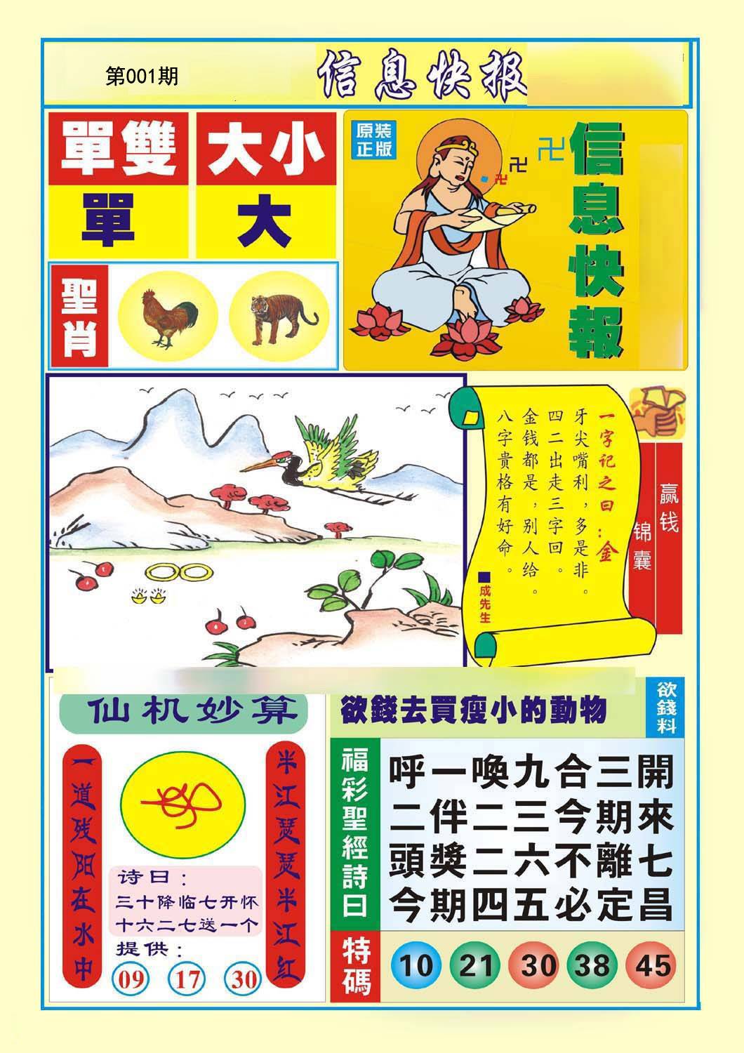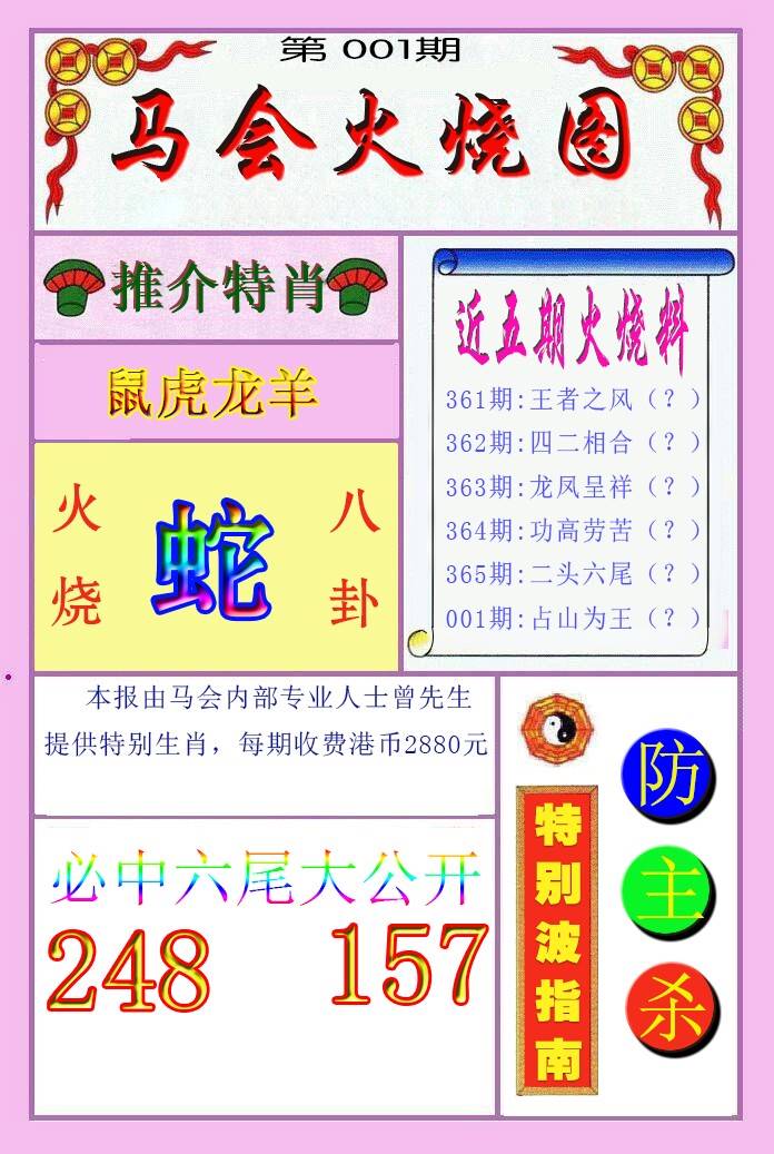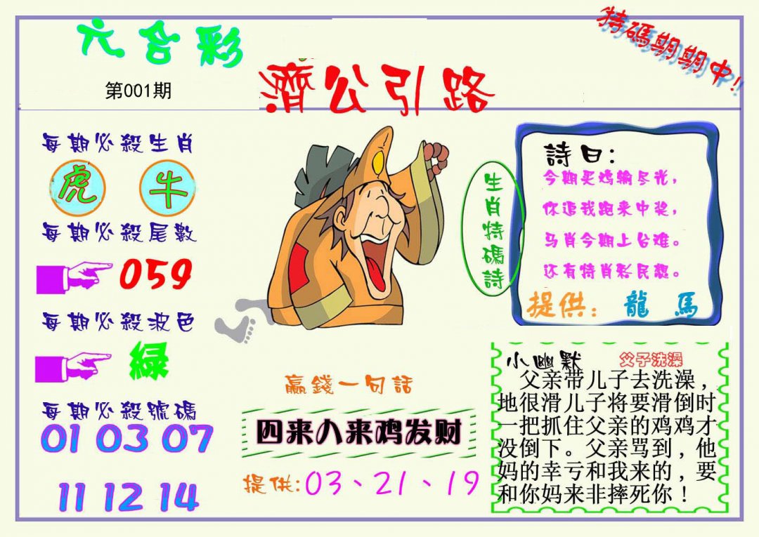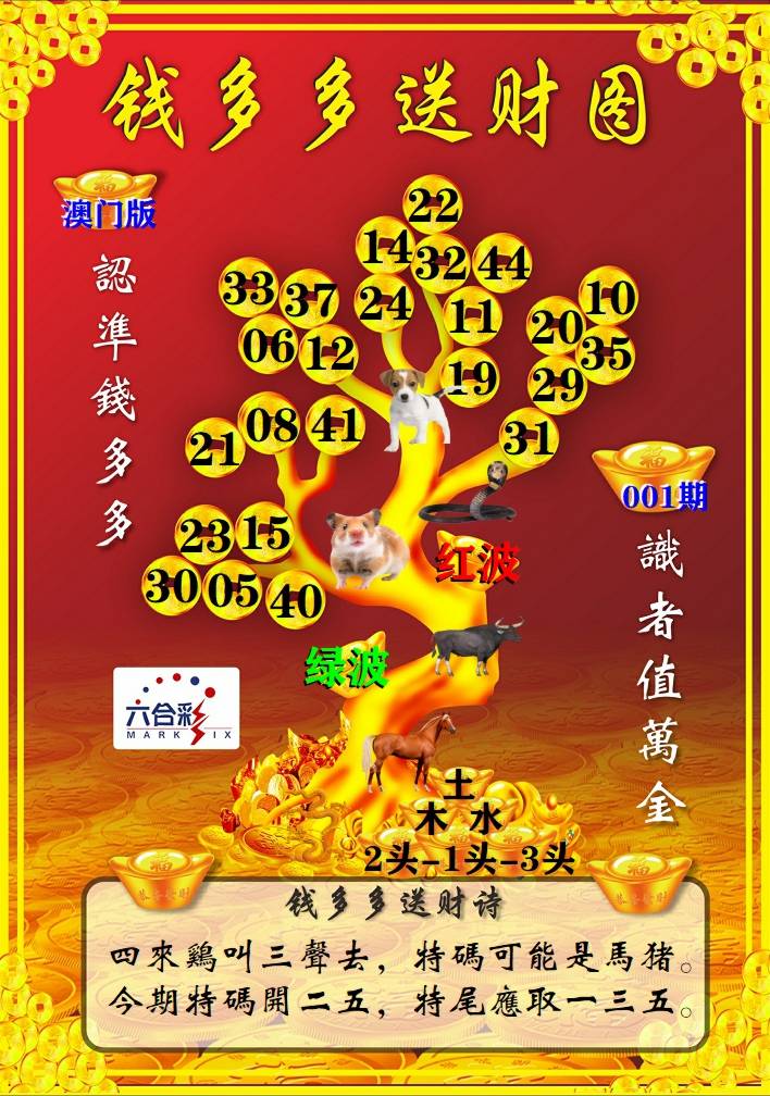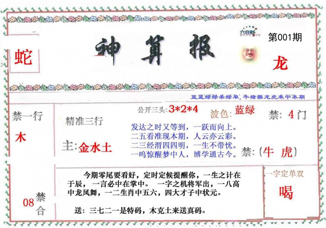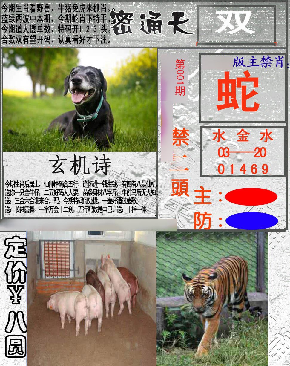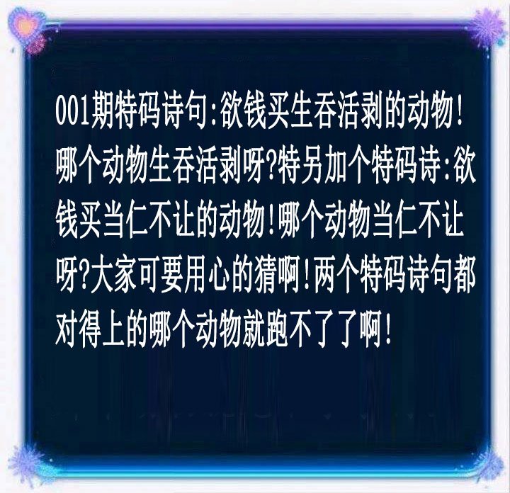 | 001期 | 今期买猴输尽光,一到开码心自知,虎头蛇尾中生肖,中得头彩无问题。 | 开?00 |