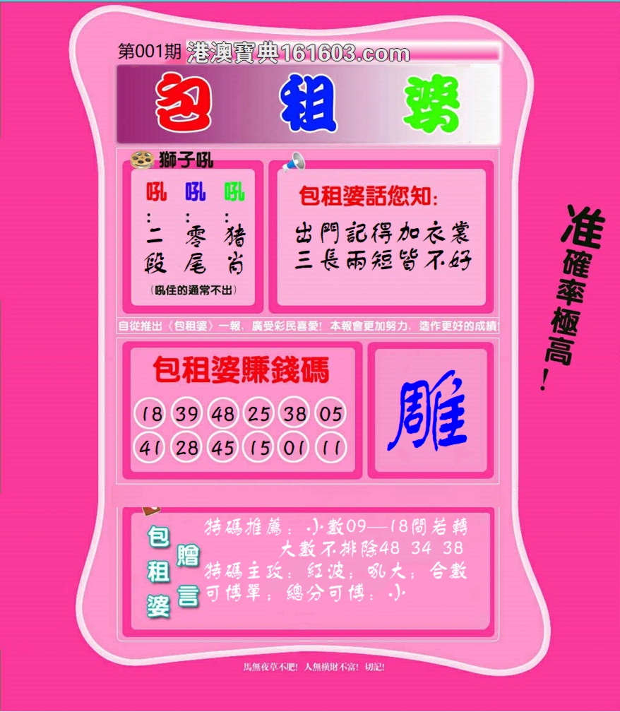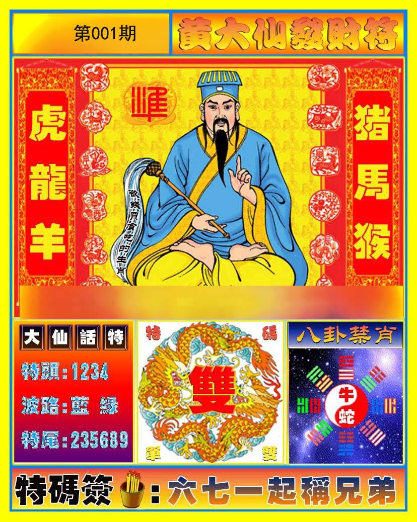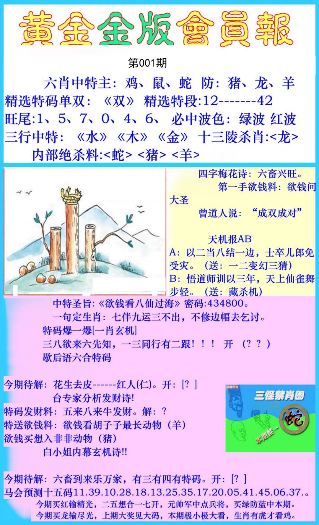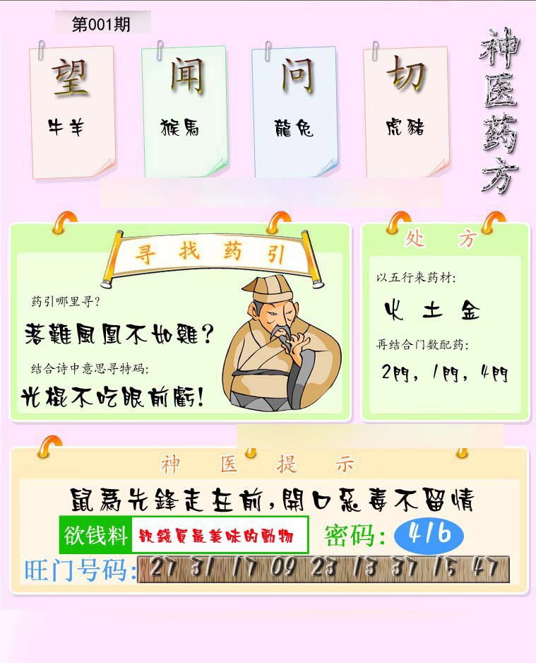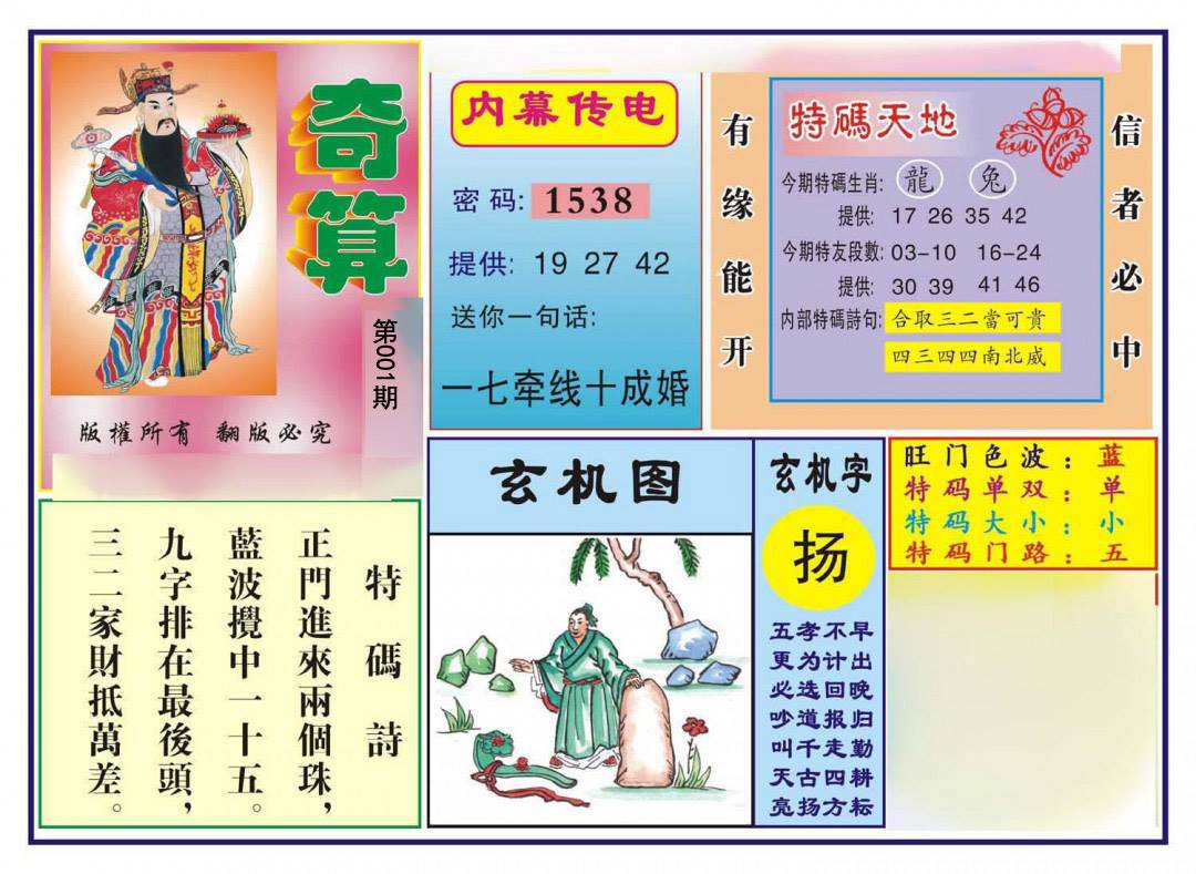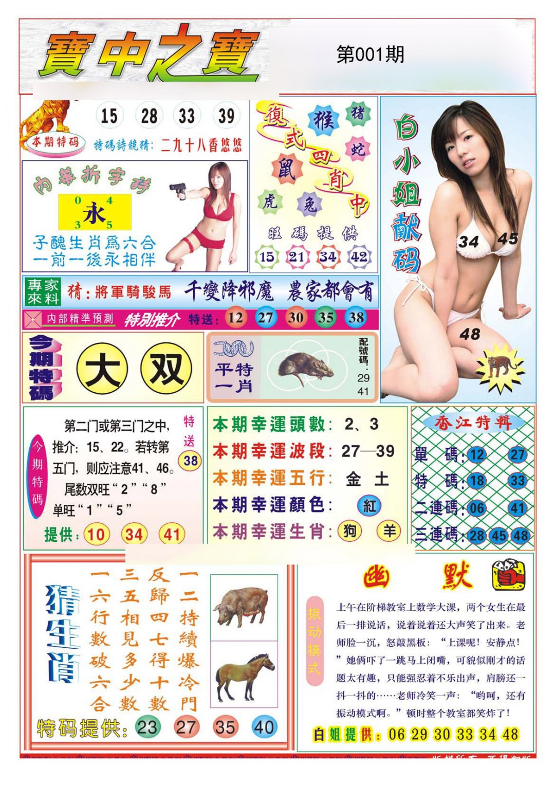 | 001期 | 今期买猴输尽光,一到开码心自知,虎头蛇尾中生肖,中得头彩无问题。 | 开?00 |